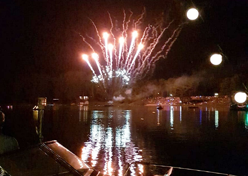 Eine Runde um den Mellensee dauert etwa eine Stunde. Gegen 21:00 Uhr kamen wir vor dem Strandbad Klausdorf wieder an, gingen vor Anker und warteten auf das abschließende Feuerwerk. Die Strandbadbetreiber hatten es organisiert und es war wirklich schön.